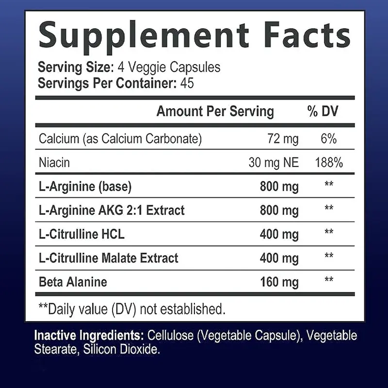 *L-Arginine (base) 800 mg: An essential amino acid that plays a crucial role in the production of nitric oxide, which helps to dilate blood vessels and improve blood flow to your muscles.